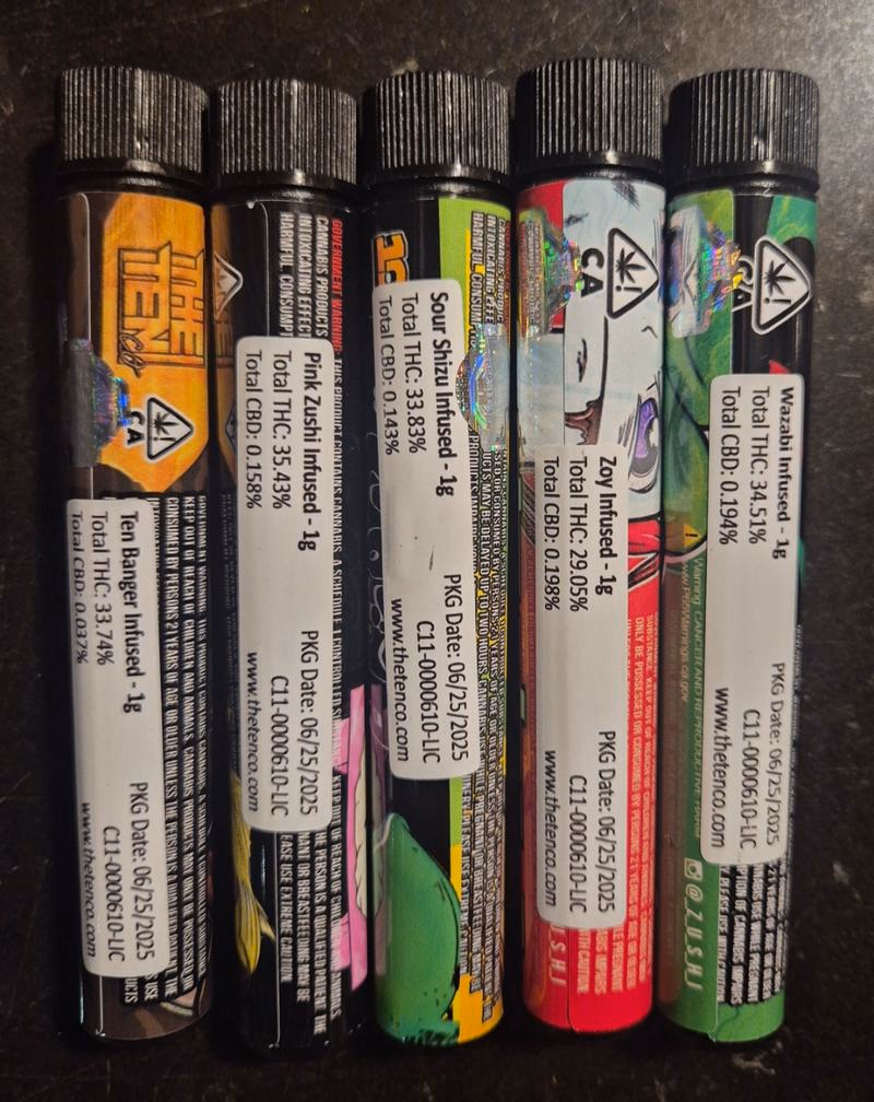 Zoy (29THC) Wazabi (34THC) Sour Shizu (33THC) Pink Zushi (35THC) Ten Banger (33THC)